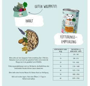 Patata, proteína de guisante, lentejas, lupina, mijo (12,1 %), espinaca (5,6 %), zanahoria, calabacín, guisantes, semillas de girasol, aceite de cártamo, semillas de chía (1,5 %), algas, hierbas, levadura de cerveza y minerales esenciales.