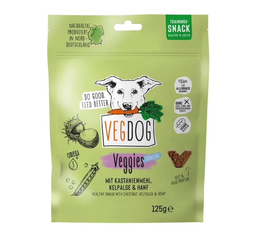 Snacks saludables con algas, importantes para el metabolismo, y cáñamo, que contiene ácidos grasos esenciales omega-3 y omega-6 que ayudan a tener una piel sana y un pelaje brillante. Además, el cáñamo proporciona minerales y vitaminas.