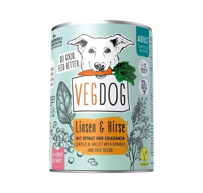 Patata, proteina di pisello, lenticchie, lupino, miglio (12,1 %), spinaci (5,6 %), carota, zucchina, piselli, semi di girasole, olio di cartamo, semi di chia (1,5 %), alghe, erbe, lievito di birra e minerali essenziali.